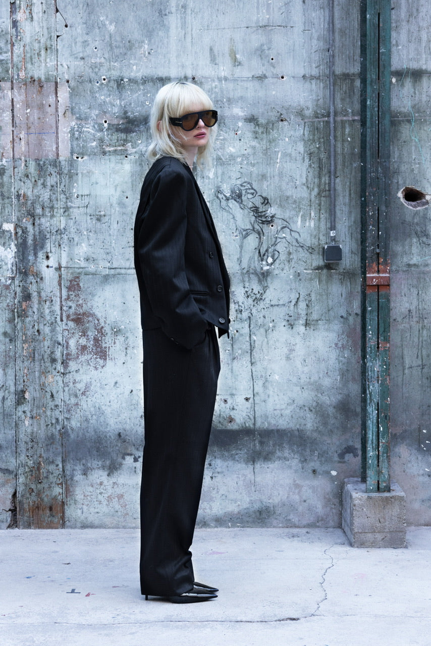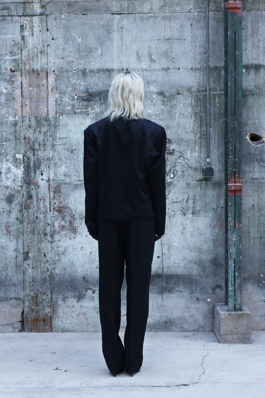 Costume croisé avec une veste à col large et un pantalon droit taille haute.