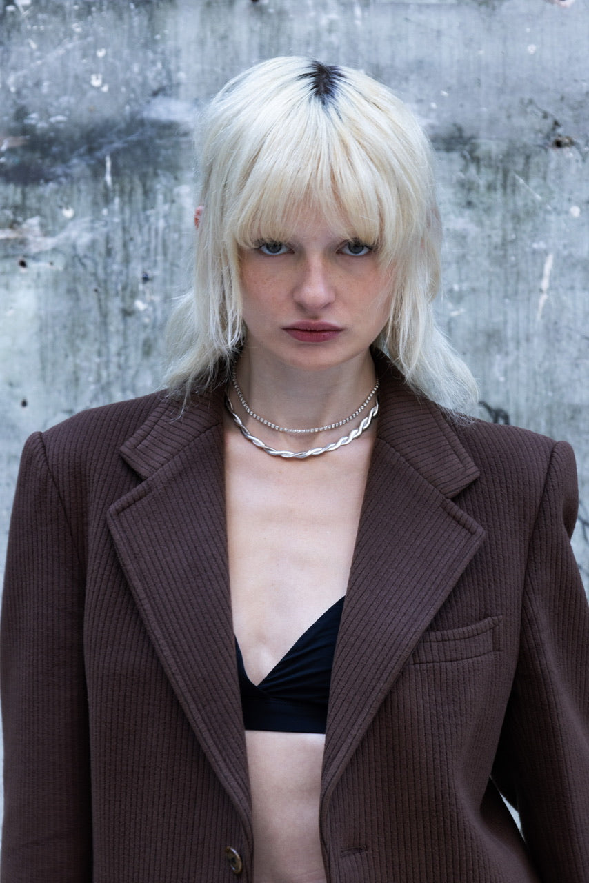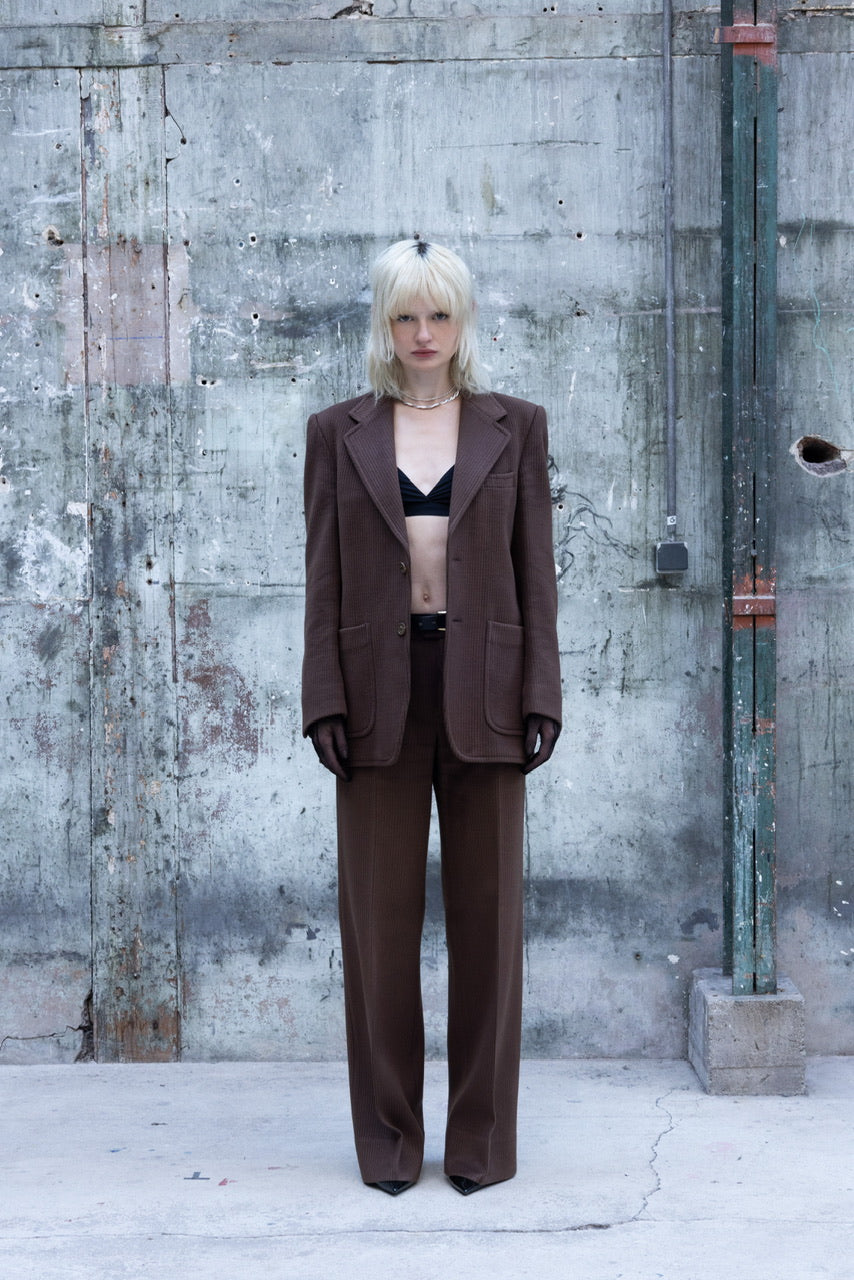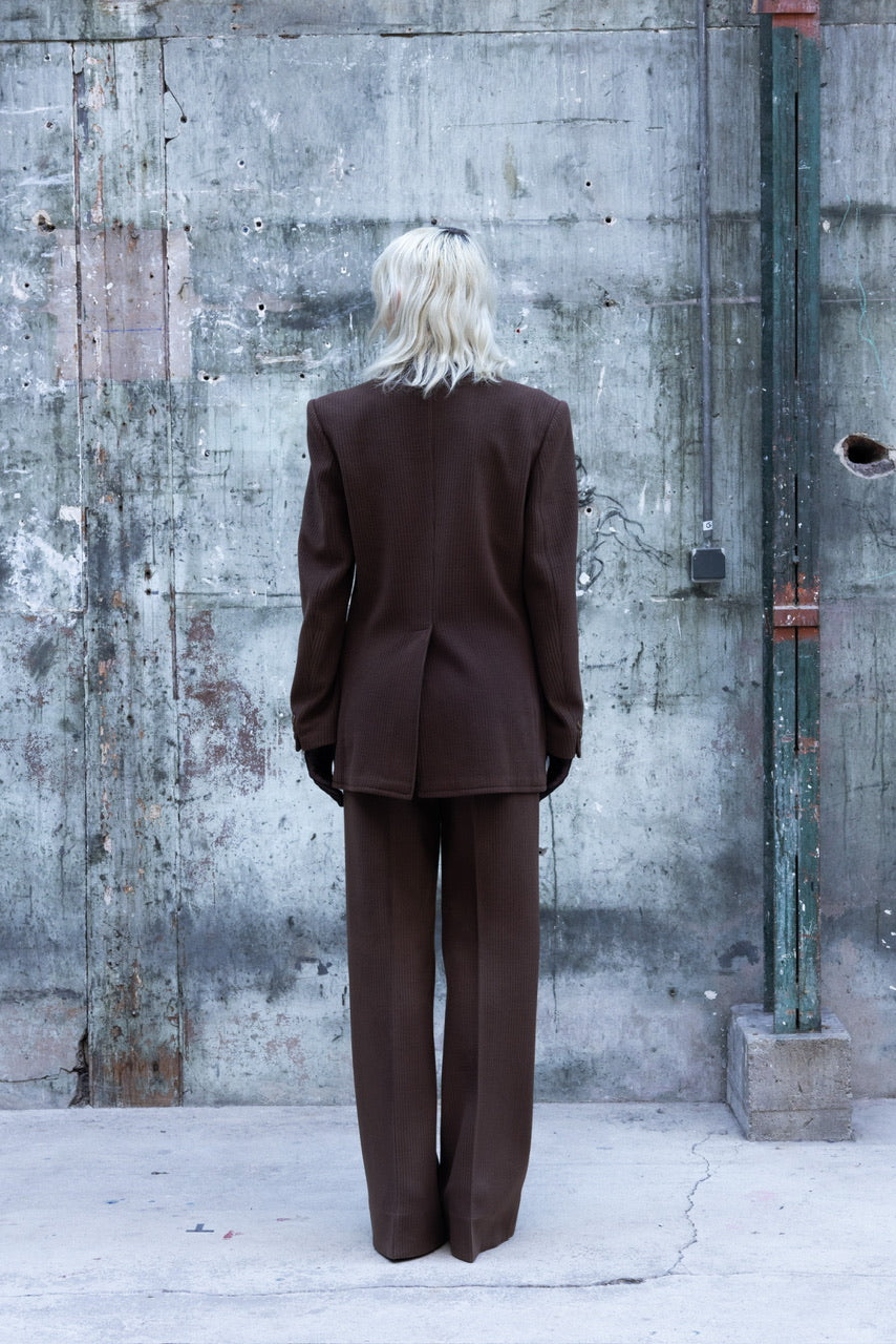 Costume en velours côtelé vintage avec une veste à col large et un pantalon taille haute évasé.