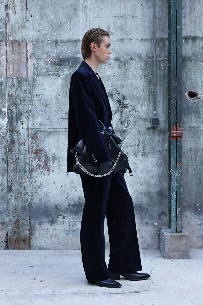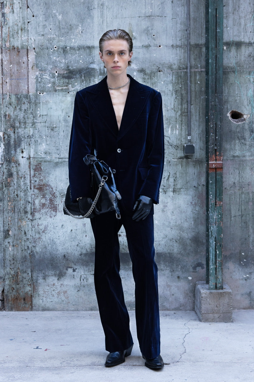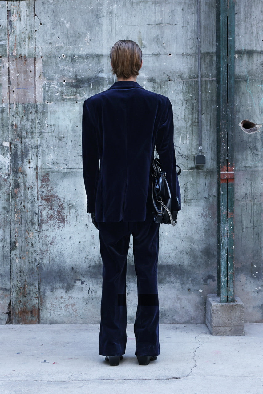 Costume en velours lisse vintage avec une veste à col large et un pantalon évasé.