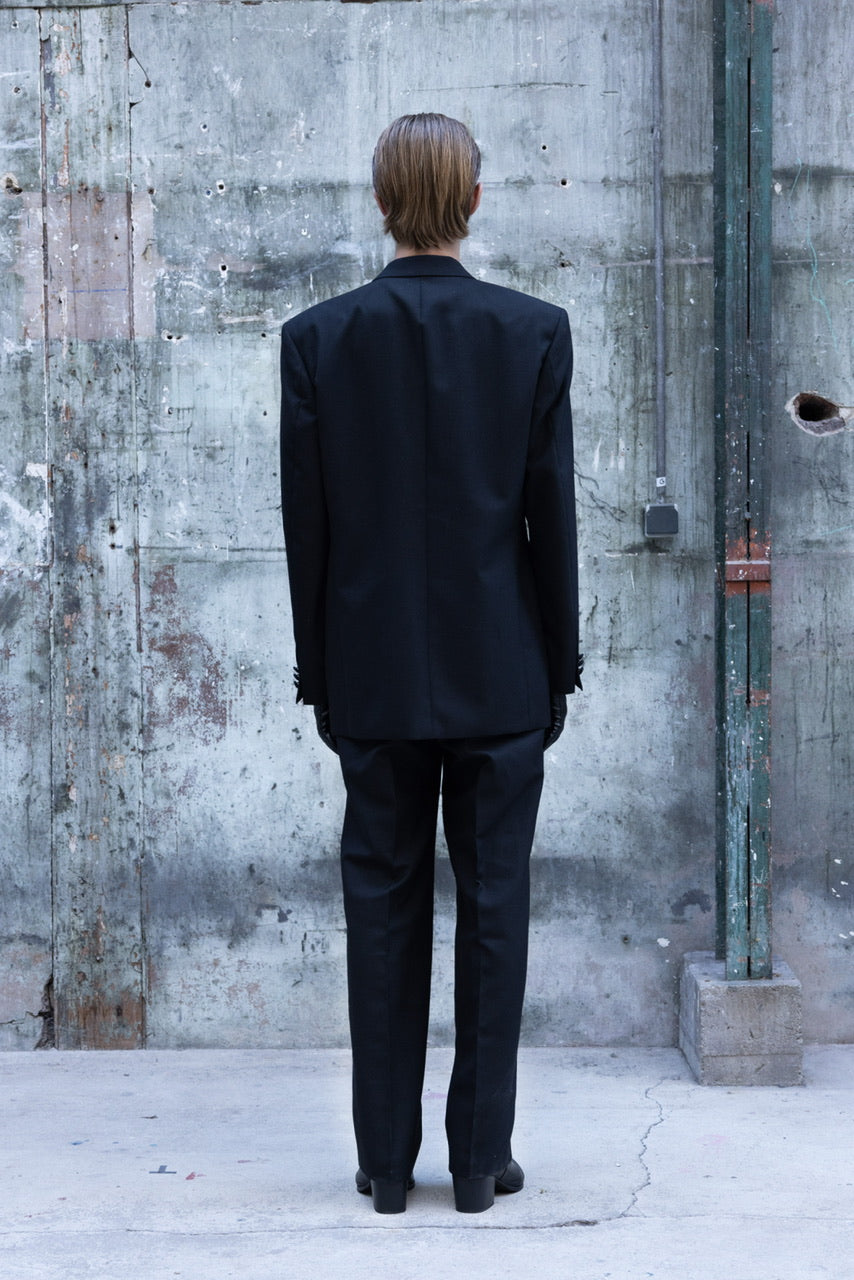 Ensemble smoking vintage avec une veste à col large et un pantalon taille haute droit.